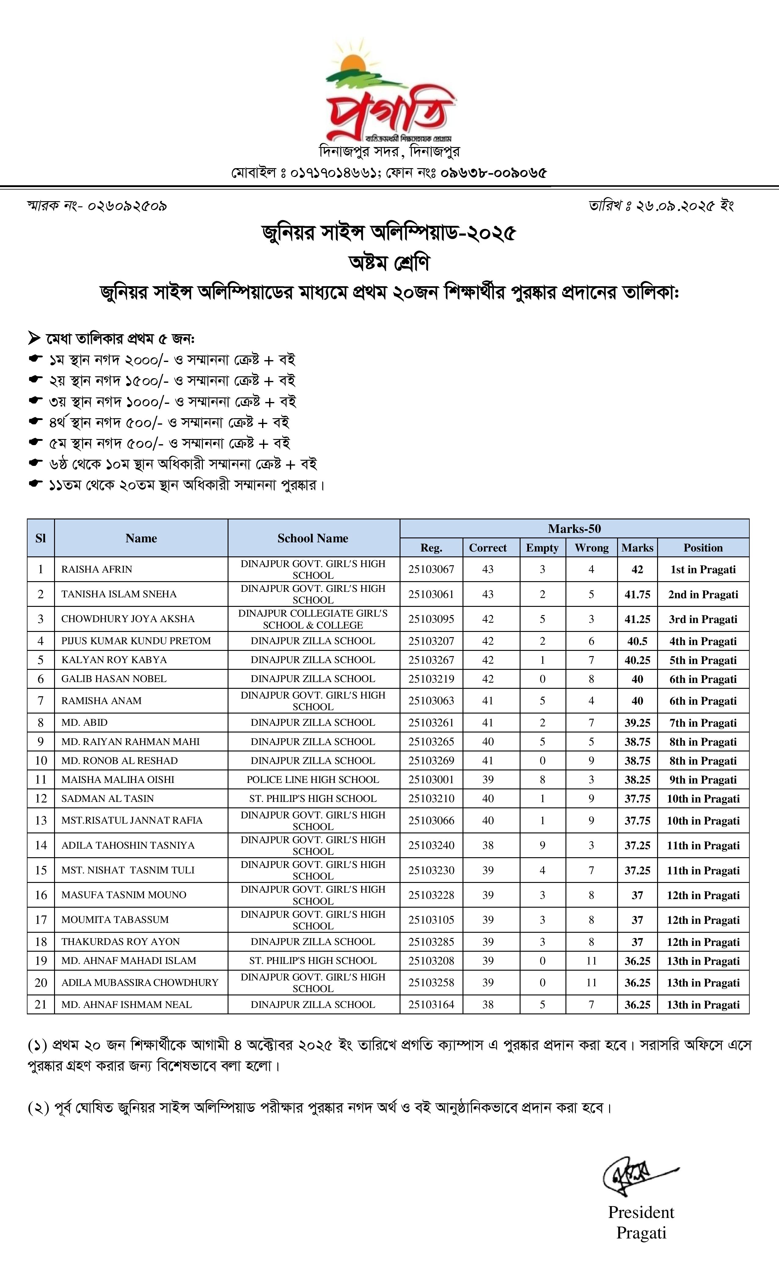 Junior Science Olympiad Competition Top 20 Position in Pragati