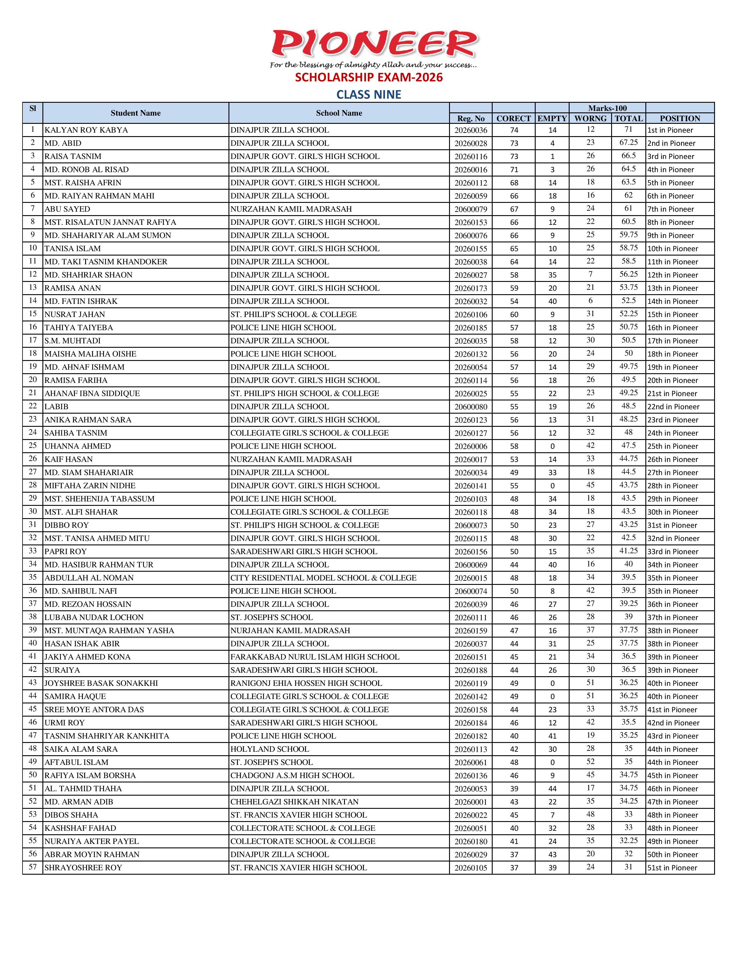 PIONEER SCHOLARSHIP EXAM ALL POSITION-2026